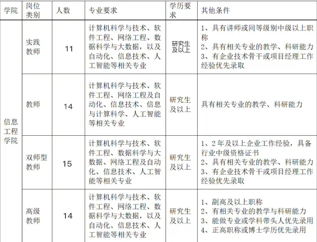 双师型教师岗:对于具有2年及以上相关工作经验,具备行业中级资格证书的,按中级职称聘用,享受学校中级职称待遇;5年以上相关工作经验,具备行业高级资格证书者,按副高职称聘用,享受学校副高职称待遇。签订双师型教师聘任协议,在聘任期内享受双师型教师岗位津贴。双师型教师在入校2年内应获得高校教师资格证,3年内应转评相应的讲师、副教授职称。